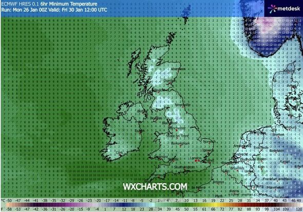 Minimal temperature climate map for January 30 (Picture: WXCharts)