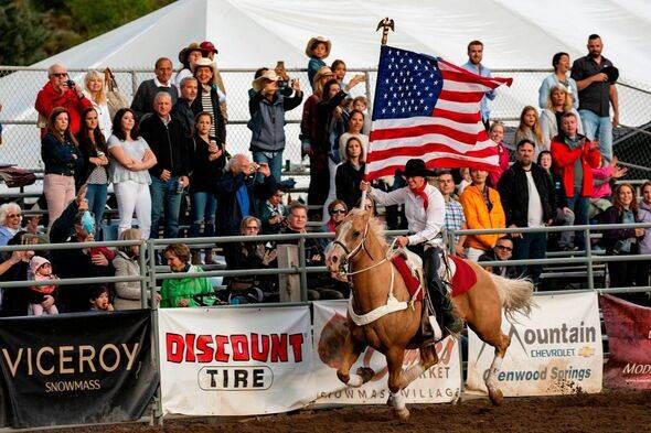 Cowgirl Mariah Hurst carries the US flag because the US nationwide anthem performs on the Snowmass rodeo (Picture: AFP by way of Getty Photos)