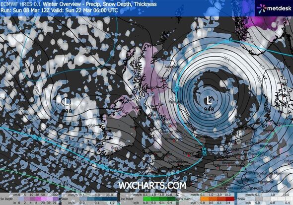 Brits have as soon as once more been tricked by a UK ‘fools’ spring’, as extra snow is predicted to be on its approach in a matter of weeks, regardless of current temperatures climbing into the mid-teens. Based on new WXCharts climate maps based mostly on the ECMWF mannequin, an intense and clear low-pressure system might be seen over the North Sea at 6am on March 22, plunging the UK again into wintry circumstances.