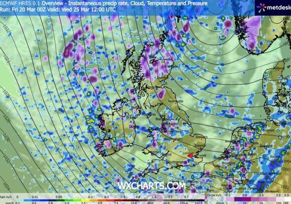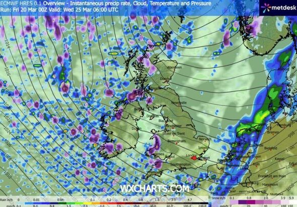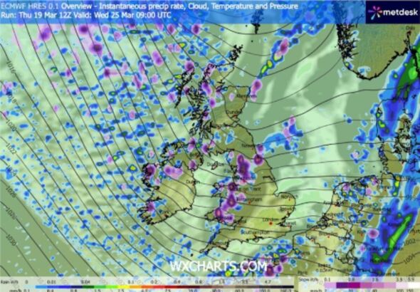 Climate maps generated by WX Charts on Friday (March 20) utilizing MetDesk knowledge present snow over elements of northern Britain on Wednesday (March 25). One map exhibits snow begins showing within the early hours, however by 9am it covers a swathe of the nation from round Leeds to Cardiff, a distance of about 200 miles.