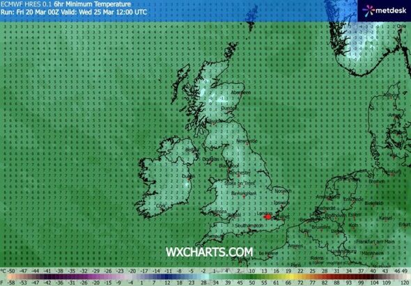 This map exhibits minimal temperatures within the single digits at noon on Wednesday (Picture: WX Charts)