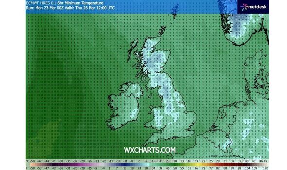 Temperatures will drop to as little as -4C (Picture: WXCharts)