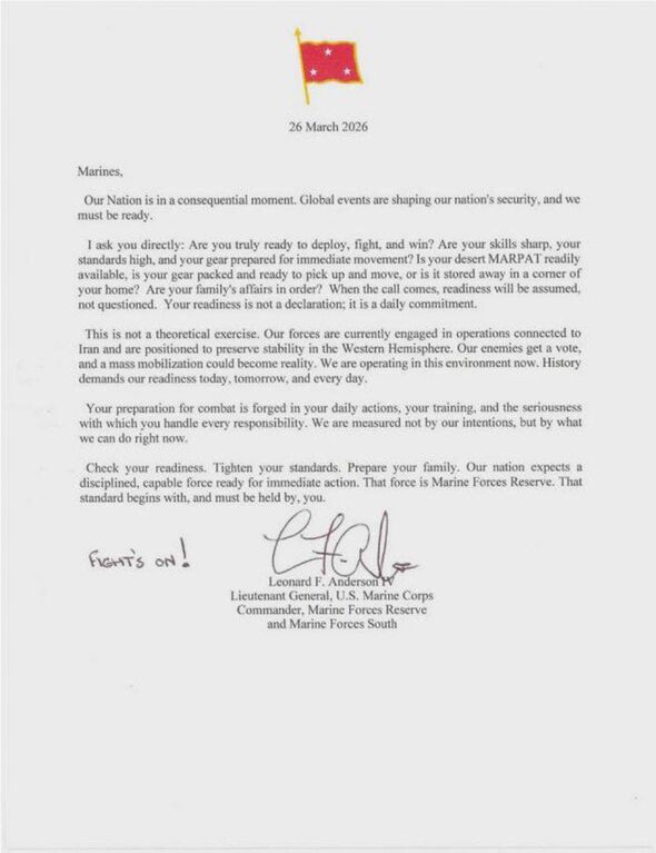 In his letter, dated March 26, Lt Gen Anderson emphasised that forces have been already “engaged in operations linked to Iran” and that any mass mobilisation “might develop into actuality”. “Marines, Our Nation is in a consequential second. International occasions are shaping our nation’s safety, and we should be prepared,” the letter, which has been shared on social media, reads. “I ask you immediately: Are you really able to deploy, battle, and win? Are your abilities sharp, your requirements excessive, and your gear ready for quick motion?”