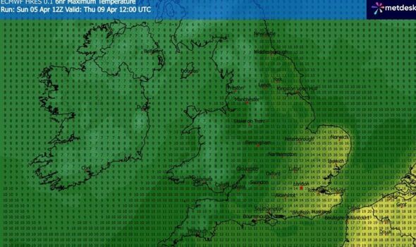 The Midlands and north of England may also welcome balmy climate, with temperatures throughout the Midlands averaging round 20C, whereas northern England will see it vary between 16C and 19C.
