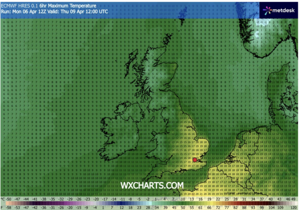 Temperatures begin choosing up on Tuesday, April 7 (Picture: WXCharts)