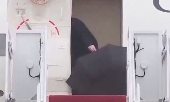 Trump headed up the steps certain for the jet beneath stormy skies, however as he approached the plane doorways, he appeared to battle to shut his umbrella.