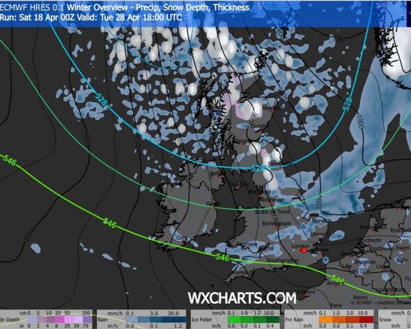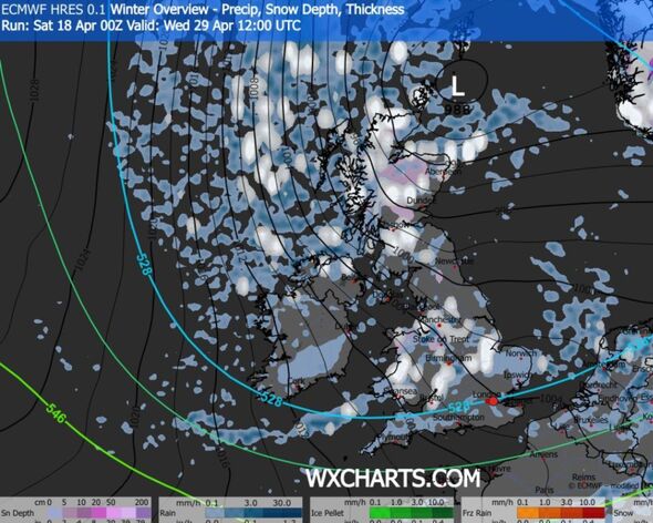 Snow may fall in the direction of the top of April (Picture: WXCHARTS)
