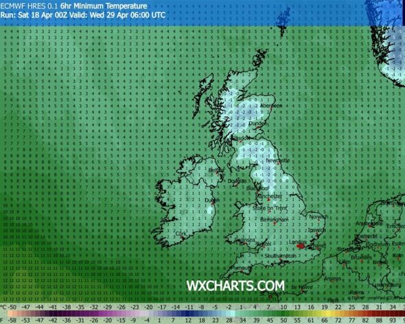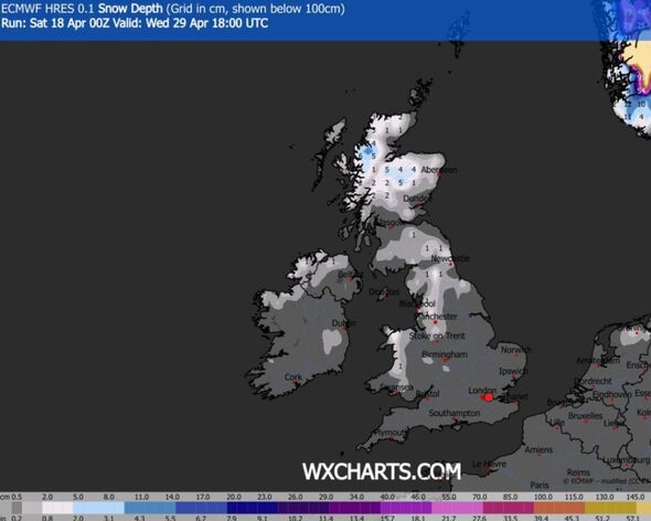 Nonetheless, it seems that winter is ready to make a dramatic return in the direction of the latter phases of April, with 26 counties throughout the nation forecast to be hit by snow, climate maps present. The chilly climate entrance will first smash into the nation on April 28 at round 6pm, with North Yorkshire and Northumberland forecast to see as much as 0.5cm of snowfall per hour. In Scotland, the Highlands may see snow depths hit 5cm whereas Perth and Kinross are prone to see 1cm of snowfall an hour. Quick ahead 12 hours to 6am on April 29, when temperatures are anticipated to drop considerably. In Scotland, climate maps point out temperatures may plunge to a bone chilling -3C in some areas.