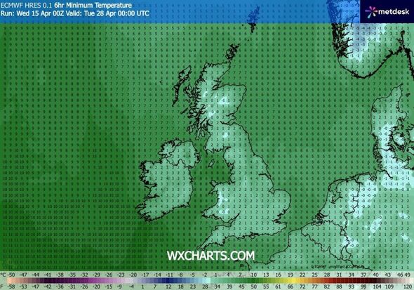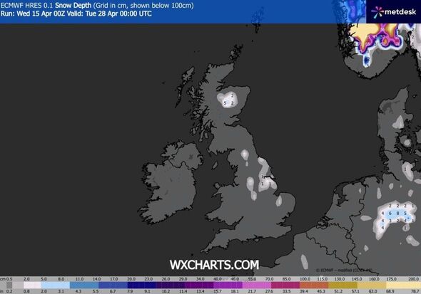 The newest maps issued by WXCharts.com present snow storm hitting Scotland and the UK on Tuesday, April 28. Temperatures will drop, and will vary between -2 and 0 within the areas the place snow might fall.