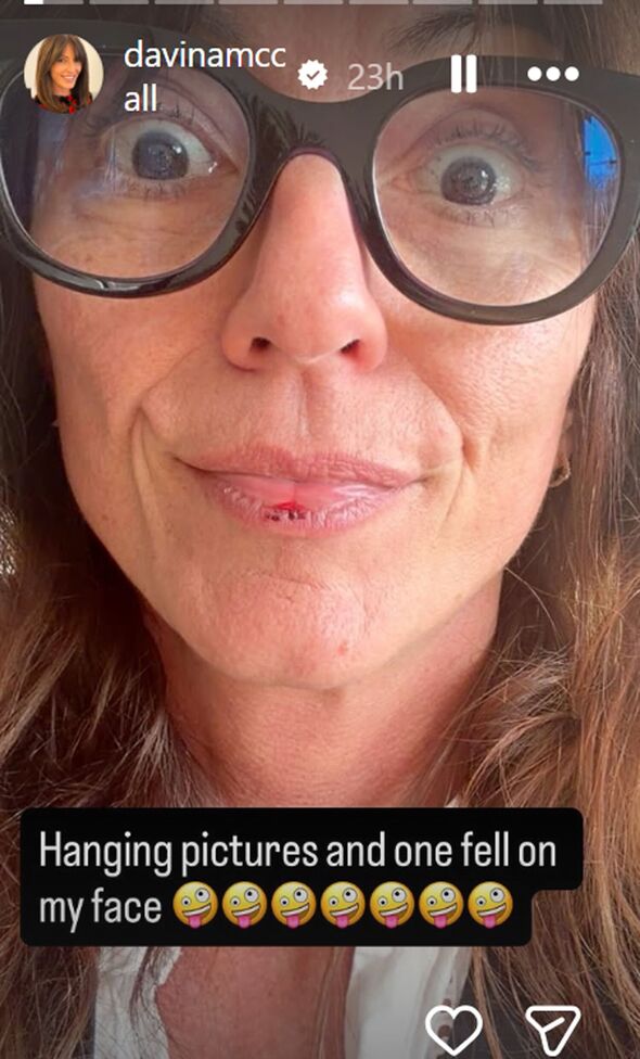However simply hours later The Lengthy Misplaced Household presenter took to her Instagram Tales and shared an harm she suffered whereas hanging up footage at residence. Posting a selfie on Friday, Davina’s lip was bloodied and barely bruised, as she informed her 2.1million followers, “Hanging footage and one fell on my face [silly face emoji].”