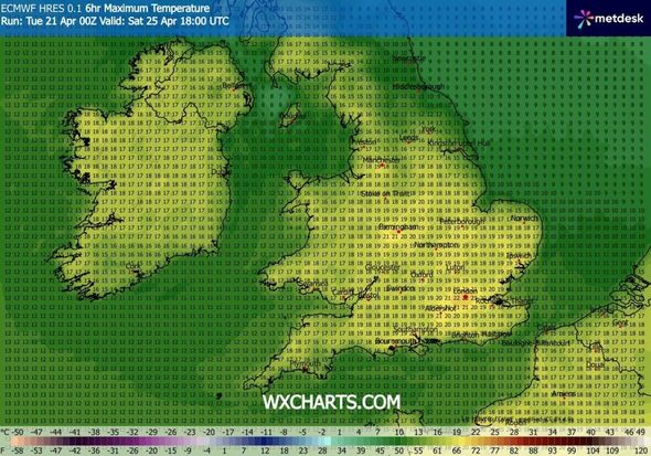 Forecast maps present temperatures may attain 20C or 21C throughout components of southern and japanese England (Picture: WX Charts)