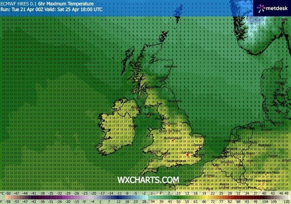 Max temperature forecast in England, Wales and Eire for Saturday (Picture: WXCHARTS)