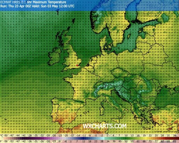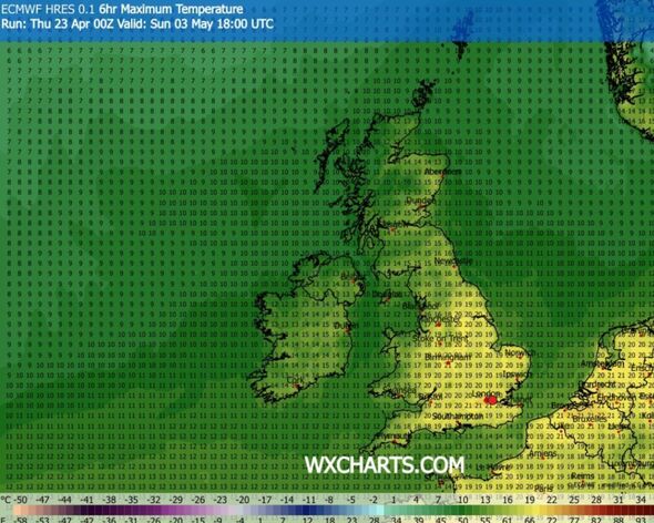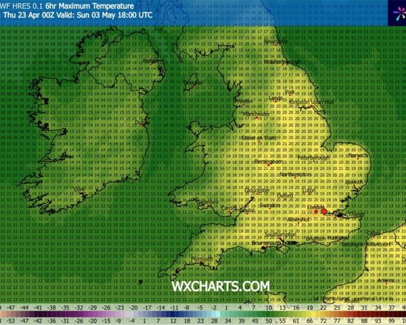 For these in Essex and Kent, the mercury may attain a heat 20C. The mercury may hover between 19C and 20C in Wiltshire, Berkshire, Bristol, Gloucester and Hampshire.