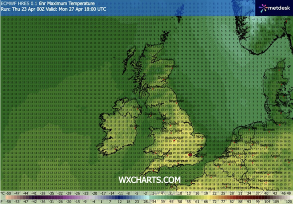 Climate map for Monday April 27 (Picture: WXCharts)