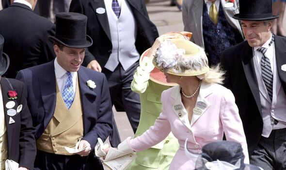 Andrew with Ghislaine Maxwell (centre) and Epstein at Ascot (Picture: Getty)