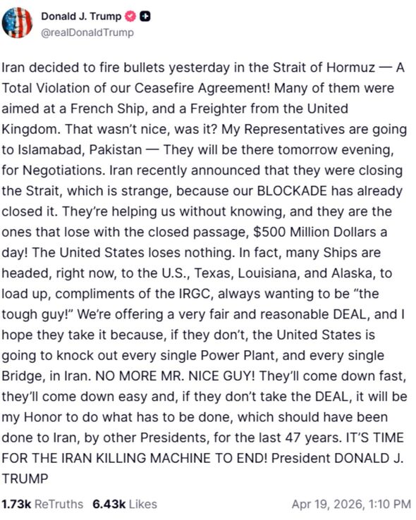 The US president added in a livid put up on Reality Social that “bridges and energy vegetation can be focused if Iran doesn’t signal this settlement”. He launched the outburst after Iran shortly reversed its determination to reopen the Strait of Hormuz, with photographs fired at vessels passing by the very important route. He raged: “Iran determined to fireside bullets yesterday within the Strait of Hormuz — A Whole Violation of our Ceasefire Settlement! A lot of them had been geared toward a French Ship, and a Freighter from the UK. That wasn’t good, was it? My Representatives are going to Islamabad, Pakistan — They are going to be there tomorrow night, for Negotiations.