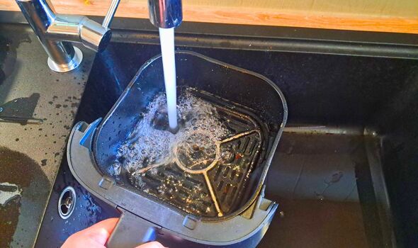 After utilizing my air fryer I run the basket beneath heat water to melt any grease (Picture: Katherine McPhillips)