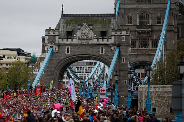 A basic view of the London Marathon as runners cross Tower Bridge (Picture: Alan Crowhurst/Getty Photographs)