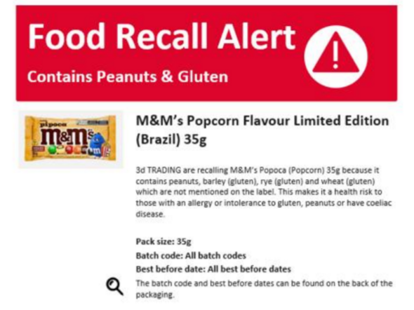 M&M’s Pipoca (popcorn) has been recalled because it accommodates peanuts and gluten, and might also include barley, rye and wheat, none of that are listed on the UK label.