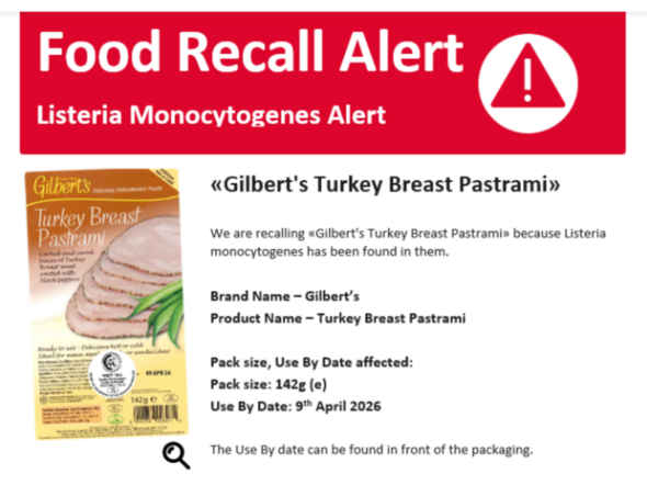 Gilbert’s 142g packs of Turkey Breast Pastrami have been recalled after listeria monocytogenes was found within the product. The FSA said that signs triggered by listeria monocytogenes might be much like flu.