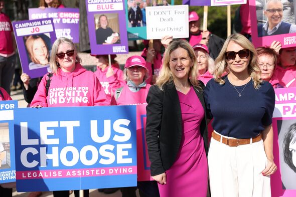 MP Kim Leadbetter joins demonstrators from Dignity in Dying outdoors Parliament (Picture: NEIL HALL/EPA/Shutterstock)